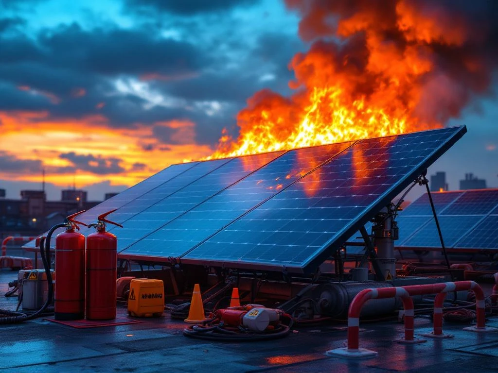 Emergency response procedures include identifying AC and DC disconnect switches. Firefighters avoid cutting through solar panels or DC wiring when possible. Water application requires special consideration due to electrical conductivity concerns.